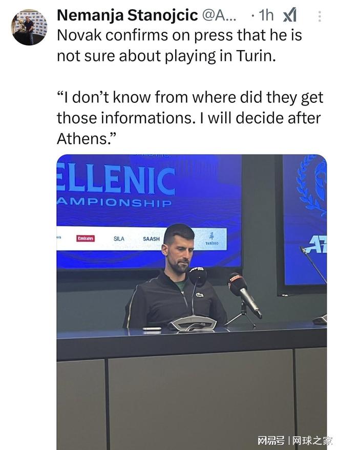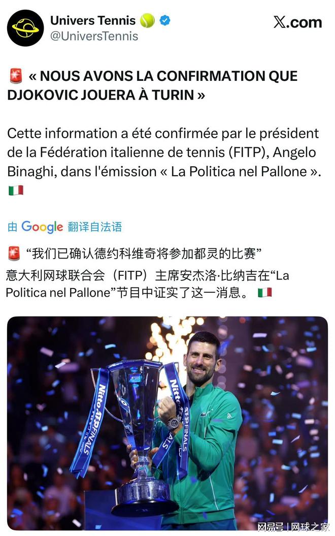 然而,赛场外的另一则消息却为德约科维奇的后续行程增添了一丝悬念。雅典站开赛前,意大利网协主席比纳吉在接受采访时 确认,德约科维奇今年将重返都灵,参加年终总决赛的角逐。