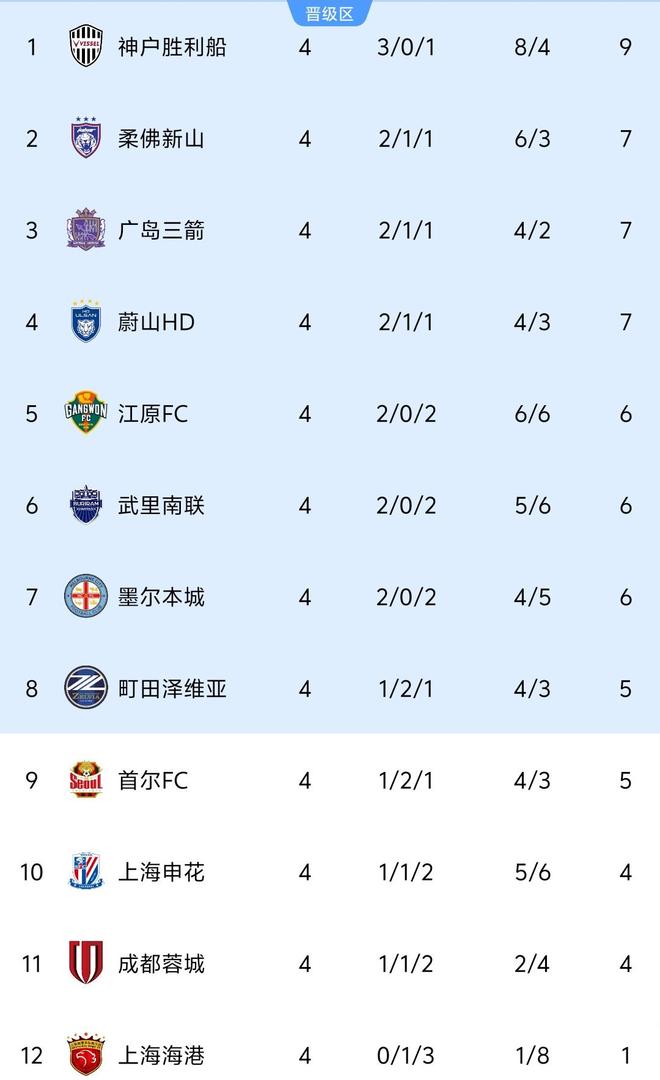 4轮过后的积分榜,由于本轮惨淡的战绩,3支中超球队不仅全都无缘前8,而且包揽了倒数3名的位置。申花和成都蓉城同积4分,申花凭借着净胜球的优势排在倒数第3,成都蓉城位列倒数第2,唯一没有取胜的上海海港积1分垫底。榜首方面,神户胜利船成为唯一一支4轮3胜的球队,以9分领跑积分榜,广岛三箭、蔚山HD同积7分分列第2和第3。本轮之后,晋级区积分线提升到5分,申花和成都蓉城都仅有1分之差,目前晋级希望还算比较大一些。两队最后4轮比赛的对手一样,3支J联赛球队以及武里南联,唯一实力相对较弱的武里南联还是客场作战,这样的赛程可谓非常艰难。仅有1分的上港目前落后晋级区已经有4分,由于仅剩下4轮比赛,他们想要晋级几乎已经没有容错空间。最后4场比赛,上港要先后挑战3支K联赛球队以及今天击败申花的柔佛新山,其中与柔佛新山的比赛同样客场作战。从赛程来看,最坏的情况3支中超球队恐怕都会无缘晋级。相关资讯
