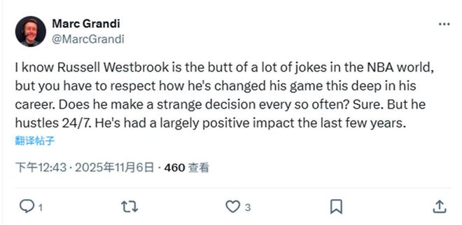 美媒纷纷惊叹面对威少这样的表现,美媒纷纷感叹与惊讶威少在刚刚过去的这个休赛期竟然一度无人问津,一直在等待重返NBA的机会,并且最终仅签下底薪。其中美媒NBACentral转发威少数据配文到:“不敢相信威少整个夏天都在寻找工作。”美记Marc Grandi则更加真诚的表示:“我知道NBA世界中有很多人都会拿威少来开玩笑,但你不得不佩服他在职业生涯后期如此出色地改变了自己的比赛方式,哪怕他偶尔会做出一些奇怪的决定,但他24小时永远保持拼搏,过去几个赛季一直交出积极正向的表现。”