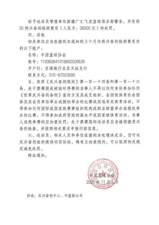 中国篮球协会发布通知,在2024-2025赛季CBA联赛赛内兴奋剂检查中,前新疆男篮运动员哈雷尔的A样本检测呈大麻酚类阳性,且其放弃检测B样本,违规成立。依据相关规定,给予该运动员禁赛3个月(2025年11月5日至2026年2月4日)的处罚;给予俱乐部医疗与反兴奋剂负责人吴杰警告处罚;给予新疆男篮警告,并令其承担20例兴奋剂检测费用36000元。同时明确了禁赛期相关限制及费用缴纳等其他事项。 原文件如下: 此前,前广东男篮球员吉伦沃特也因兴奋剂违规被禁赛3个月。 来源 东方体育日报