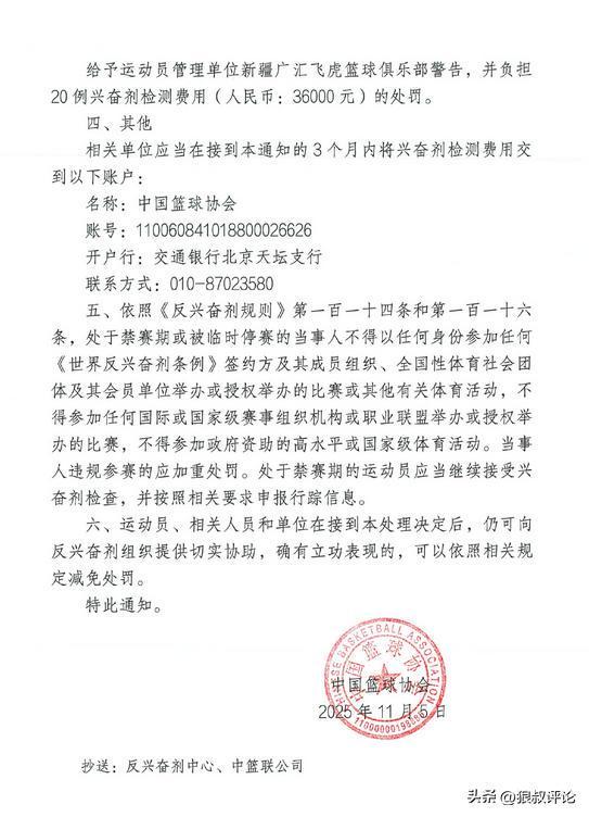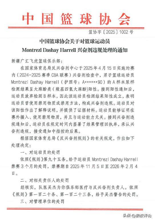 北京时间11月6日,根据中国篮协官方社媒公示,对于上个赛季新疆外援哈雷尔事件开出罚单,禁赛3个月,以及新疆俱乐部承担36000元的检测费用。具体如下: