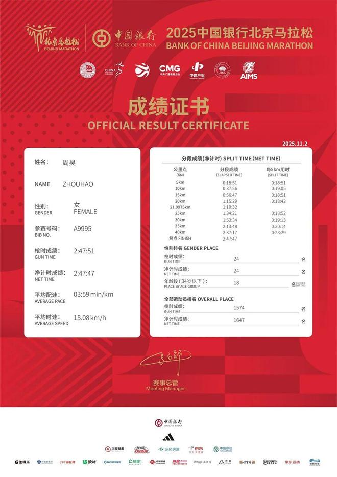 更疯狂的是拿到冠军喜提5万美元的奖金后,周昊没有退出隔一天鸣枪起跑的北京马拉松。而是火速转场,从赛场赶到机场,搭乘飞往北京的航班,从机场地铁转到入住的酒店已是夜幕降临。第二天,回到她之前重新达标国家健将的“福地”,以2:47:47完赛。